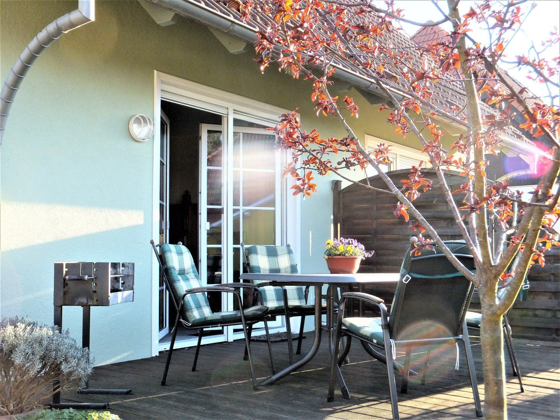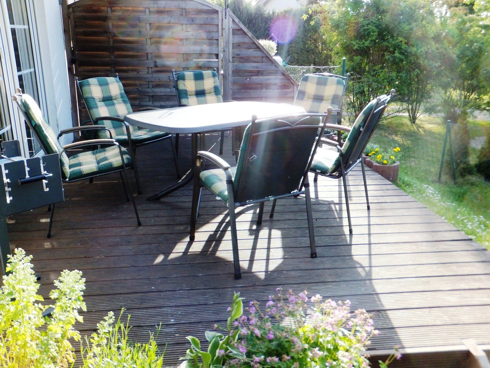 Eine grosse möblierte Holzterrasse in Süd-West-Lage läd ein zum Frühstück oder für Grillabende in gemütlicher Runde.