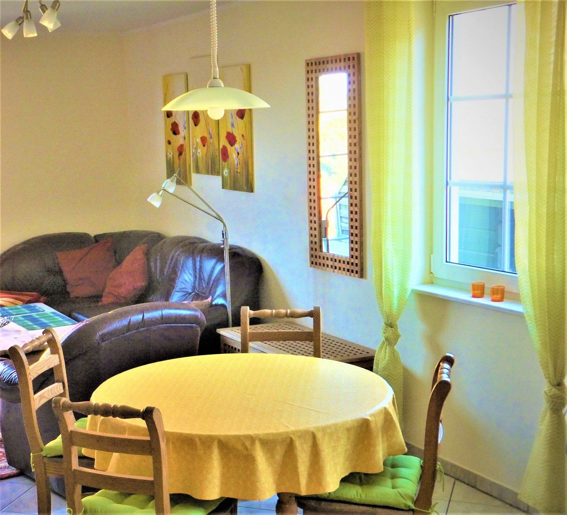 Ein Blick auf den Wohn- und Essbereich mit Esstisch, sowie einer bequemen Ledersitzecke.