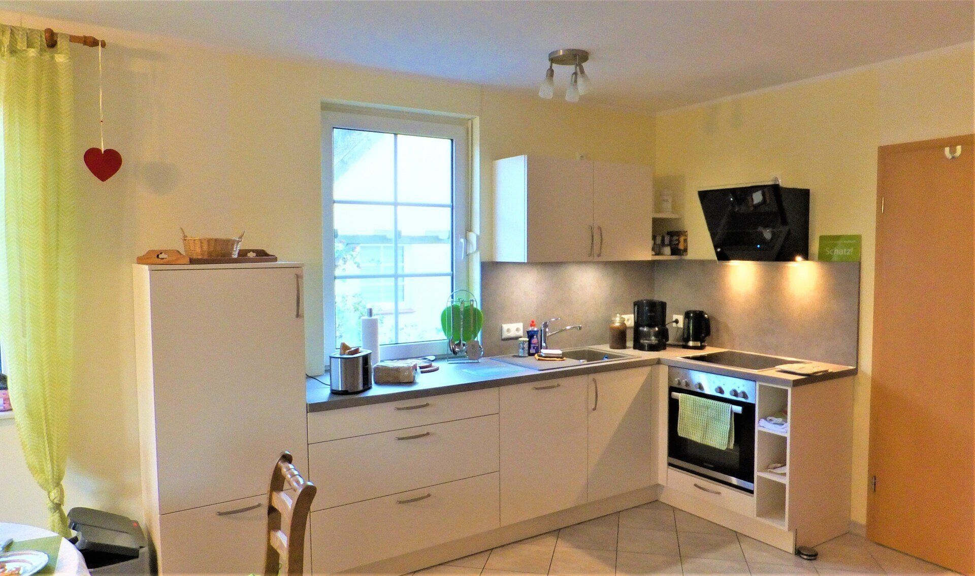 Die Ausstattung der Küchenzeile mit Ceranfeld, Heißluftherd, Geschirrspüler sowie eine Kühl-Gefrierkombination, Kaffeemaschine, Toaster, Mikrowelle und Geschirr läßt keine Wünsche offen.